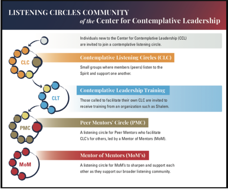 Contemplative Listening Circles (CLC’s) make up the heart of programming here at the Center for Contemplative Leadership. These small groups, often called Group Spiritual Direction or Group Spiritual Companionship elsewhere, centralize listening prayer as a means for connecting with God and neighbor. Guided by a trained facilitator, each circle typically consists of 4-5 participants. In a framework of equally shared spiritual leadership, participants are invited to listen to the Spirit on one another’s behalf over the course of a 90-minutes session.