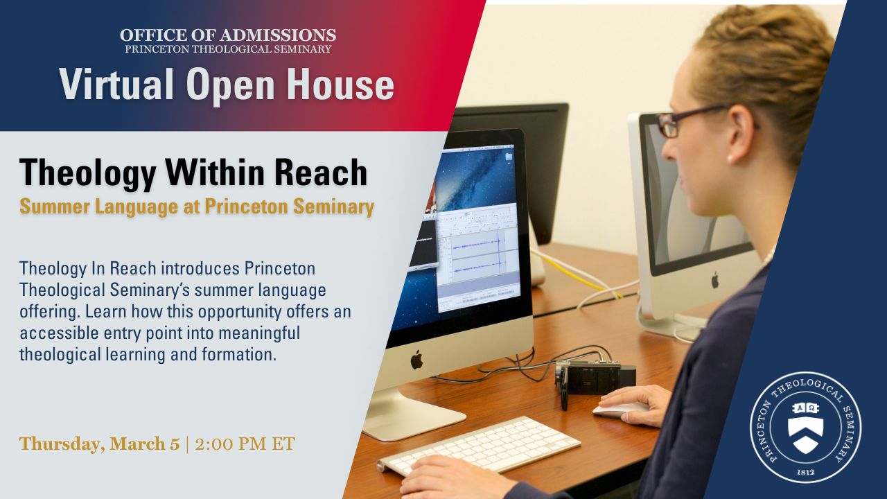 Theology In Reach is a virtual information session highlighting Princeton Theological Seminary’s flexible and accessible learning opportunities beyond a traditional degree program. Princeton Seminary offers both degree and non-degree pathways, and this session explores a meaningful entry point into theological study: summer language study.
