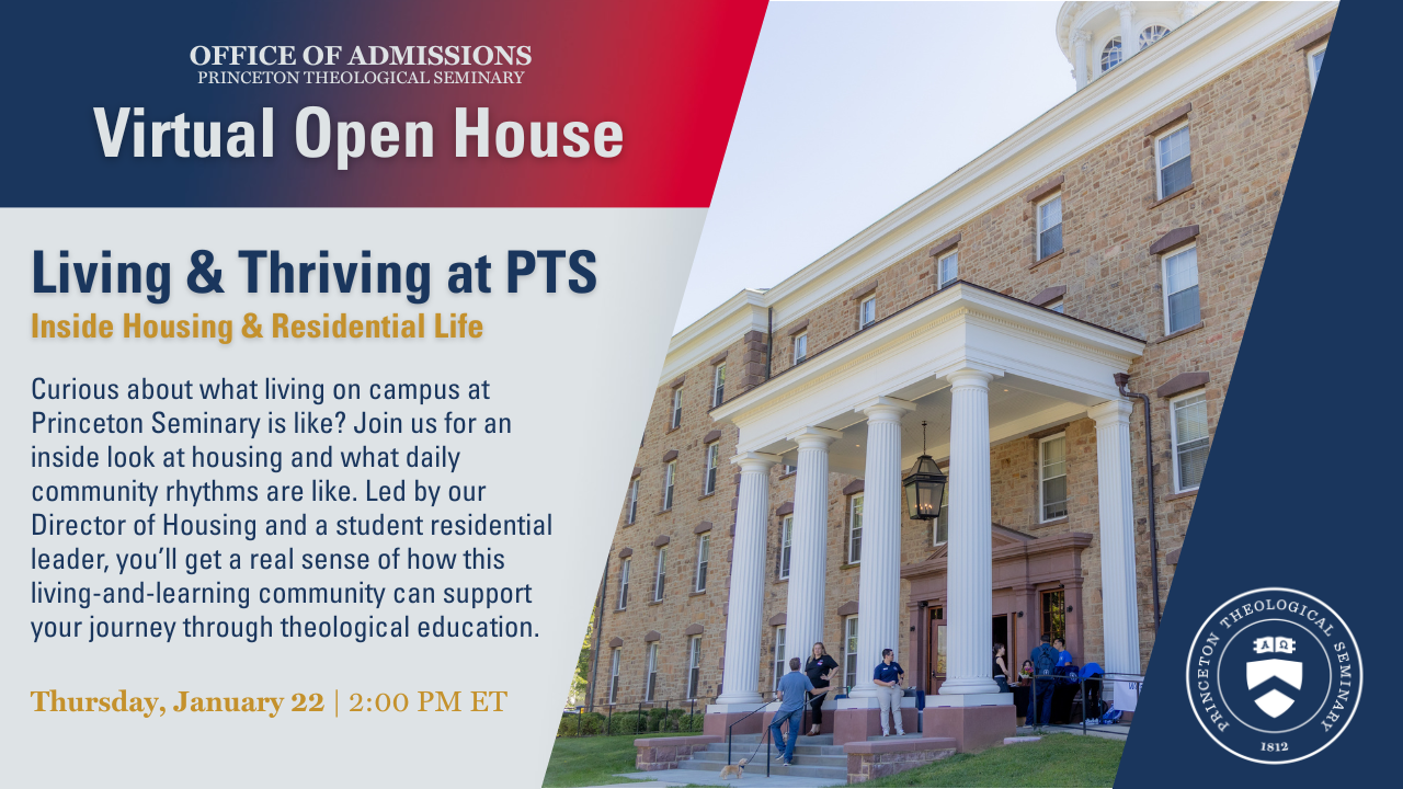 January 22, 2026 @ 2:00 pm - 3:00 pm Living and Thriving at PTS: Inside Housing and Residential Life Virtual/Zoom Join Kate Rufalo, Princeton Seminary's Director of Housing, for an in-depth look at life in covenant community. We’ll walk through on-campus housing options, the application and assignment process, and share what admitted students can expect while planning their move. You’ll also hear from a current Deacon (yes, our resident assistants really are called Deacons), who’ll […]