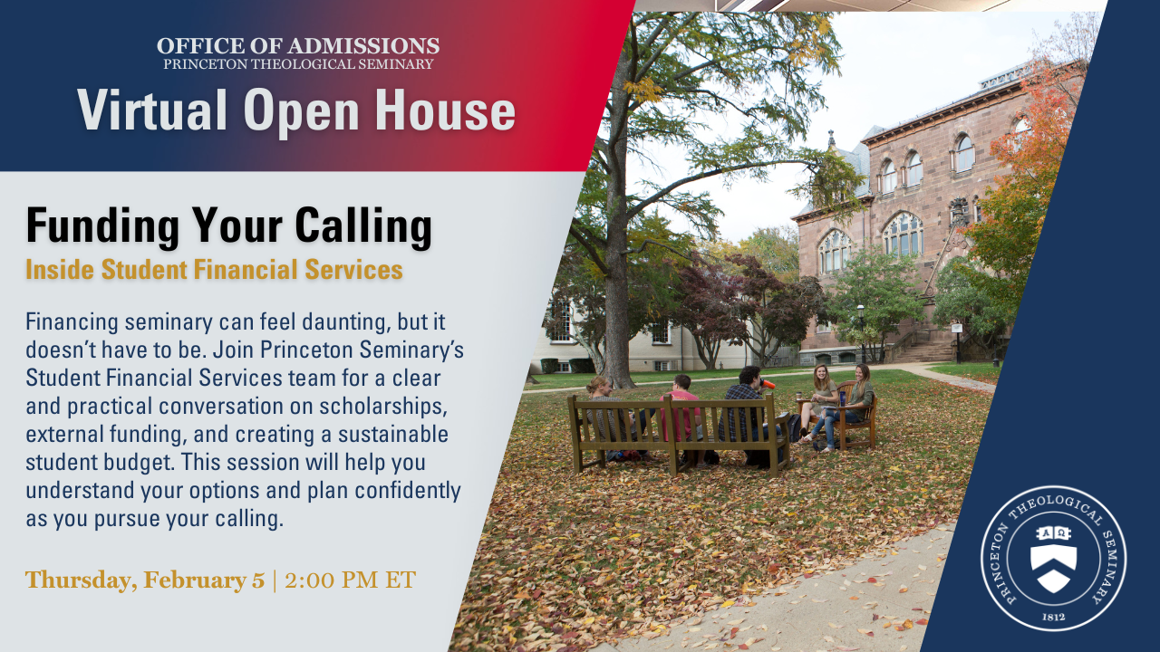 November 20, 2025 @ 2:00 pm - 3:00 pm Funding Your Calling Virtual/Zoom Navigating finances for graduate school isn't easy. That's why we are excited to introduce you to our Student Financial Services Team to share more about financial aid opportunities at Princeton Theological Seminary.
