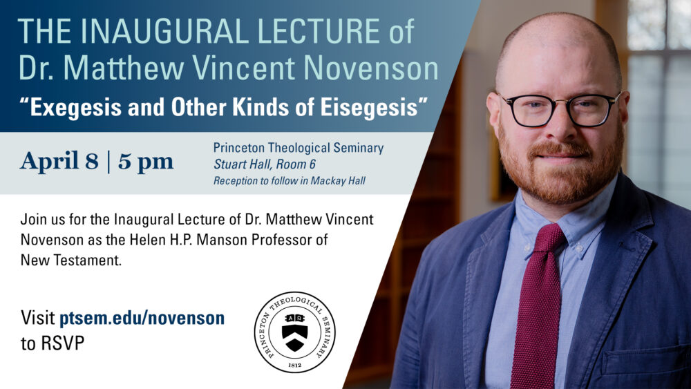 April 8 @ 5:00 pm - 6:30 pm Inaugural Lecture of Dr. Matthew Vincent Novenson: “Exegesis and Other Kinds of Eisegesis” Stuart Hall - Room 6 64 Mercer St, Princeton, United States This lecture interrogates that classic practice of biblical studies and other textual disciplines: exegesis. It reconsiders what kinds of reading count as exegesis, and it questions the commonplace that defines exegesis over against its supposed contrast term: eisegesis.